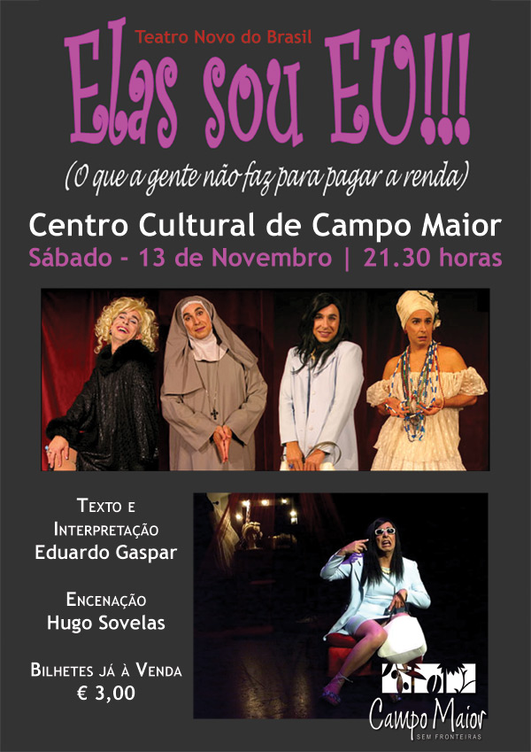 “O que acontece quando uma empregada doméstica consegue convencer o seu patrão, às vésperas de uma estreia, de que ele é um péssimo actor?” É a partir desta situação que o brasileiro Eduardo Gaspar desenvolve a peça “Elas sou Eu”, com o subtítulo “O que a gente não faz para pagar a renda?”. Na pele de Lucineide, a serviçal que persegue o sonho de se transformar numa estrela – passando a dar autógrafos como Lucy Neyde, naturalmente -, o autor e intérprete desdobra-se em diversas personagens femininas (incluindo uma misteriosa freira que nunca foi vista).